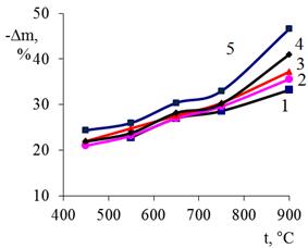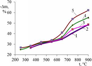 Для образцов ТРСГ, синтезированных при Qуд =150 мА·ч/г, ТРГ удается получить при 450 °С и выше, с ростом температуры dТРГ закономерно снижается, при чем при t > 600 °C время термообработки не оказывает влияния на насыпную плотность ТРГ. Выход газообразных компонентов, наоборот, с ростом температуры возрастает и значительно зависит от времени термообработки. При этом, помимо превращения интеркалата в газообразные продукты, при t≥ 580 °C углерод окисляется на воздухе до СО и СО2. Согласно данным рис. 6, убыль массы образца ТРСГ превышает массу внедренного интеркалата (Δm ≈ 30%). Увеличение температуры свыше 700 °С и времени термообработки приводит к существенному выгоранию углерода.