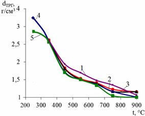 от температуры и времени обработки для переокисленных ТРСГ (720 мА·ч/г): 1 – 3, 2 – 10, 3 – 15, 4 – 25, 5 – 40 с