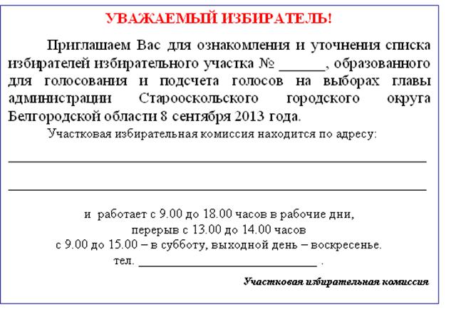 Выборы главы администрации Старооскольского городского округа Белгородской области 8 сентября 2013 года Участковая избирательная комиссия избирательного участка № ________ ______________________________________________________ границы избирательного участка (наименования улиц, номера домов) Председатель комиссии ________________________________ Заместитель председателя комиссии _____________________ Секретарь комиссии ___________________________________ Режим работы с 9.00 до 18.00 суббота с 9.00 до 15.00 перерыв с 13.00 до 14.00 выходной день – воскресенье |