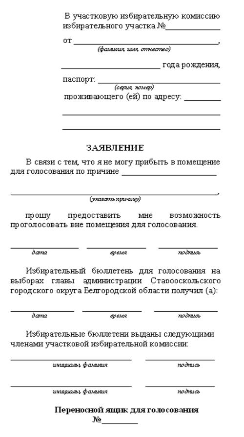 Мы, нижеподписавшиеся члены участковой избирательной комиссии избирательного участка № ____ составили настоящий акт о том, что в присутствии лиц, перечисленных в пункте 3 статьи 30 Федерального закона «Об основных гарантиях избирательных прав и права на участие в референдуме граждан Российской Федерации», части 3 статьи 34 Избирательного кодекса Белгородской области провели с ______ час. ____ мин. по ___________ час. ________ мин. голосование вне помещения для голосования с использованием переносного ящика для голосования № ___.