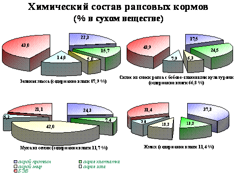 Семена рапса и продукты их переработки. В кормлении животных могут использоваться как сами семена рапса, так и продукты их переработки — жмых, шрот и растительное масло. Наибольшую энергетическую ценность имеют семена рапса, поскольку содержат 40—48% жира и 21—33% сырого протеина при достаточно высоких коэффициентах переваримости (84,4—93,4%). Энергетическая ценность жмыха значительно ниже, чем семян. После отжима в нём остаётся 7—12% жира и 37—38% сырого протеина. Шрот содержит 1—5% жира и до 42% протеина, но энергетическая ценность его по сравнению с семенами также ниже. Рапсовые жмых и шрот по энергетической ценности (11,3 и 10,4 МДж обменной энергии) не уступают подсолнечниковым (11,4 и 10,6 МДж).
