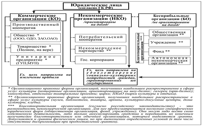 Коммерческие организации (КО) преследуют извлечение прибыли в качестве основной цели своей деятельности. Деятельность некоммерческих организаций (НКО) культуры направлена на удовлетворение социально-культурных потребностей граждан, гарантированных им государством.