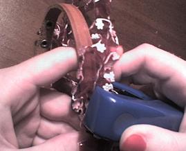 1 | Степлер/жёсткая игла и нитки, ошейник, тесьма. | С помощью степлера или жёсткой иглы и ниток присоединим тесьму к ошейнику. |