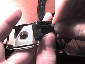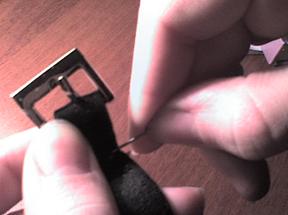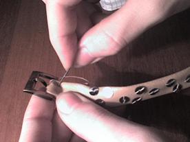 1 | Часть от старых кожаных сапог с металлической вставкой, дополнительная металлическая вставка, жёсткая игра, чёрные нитки. | С помощью жёсткой иглы и ниток присоединим дополнительную вставку к основной части. |