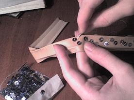 1 | Косая бейка, паетки, игла, кремовые нитки. | Пришьём паетки к косой бейке с помощью иглы и ниток. |