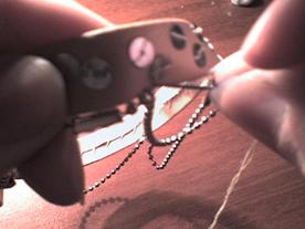 3 | Полученный ошейник, кремовые нитки, игла, цепочки от этикеток. | Пришьём цепочки к полученному изделию с помощью иглы и ниток. |