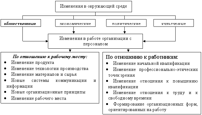 Существование организации невозможно без изменений (Рис.11.1.). Формирование кадровой политики организации определяется изменениями в производительных силах и зависит от экономической, социально-политической и культурной сред.
