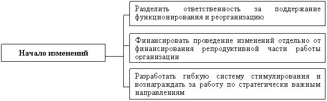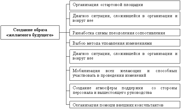 1. создание образа «желаемого будущего» - того, к чему должна стремиться организация. Формирование этого образа важно совместить с организацией так называемой «стартовой площадки» (первого подразделения, включившегося в изменения и демонстрирующего результаты изменений) (Рис.11.4);