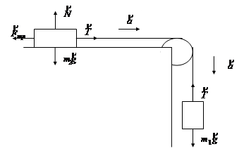 Невесомый блок укреплен на конце стола. Гири одинаковой массы m1 = m2 = 1 кг соединены нитью и перекинуты через блок. Коэффициент трения гири о стол μ = 0,1. Найти ускорение а, с которым движутся гири, и силу натяжения нити Т. Трением в блоке пренебречь.