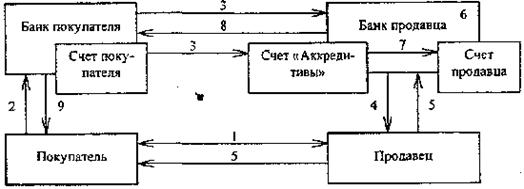ответствуют ли они тем, которые сформулированы в контракте и в других соглашениях, и если это не так, просит покупателя изменить условия аккредитива. Если условия аккредитива соответствуют заключенному контракту, продавец осуществляет поставку товара и передает отгрузочные или иные документы, указанные в условиях аккредитива, в свой банк (5). Банк продавца проверяет представленные документы, и если они соответствуют условиям аккредитива, переводит денежные средства на счет продавца (7) и пересылает документы в банк покупа, который их иередаег непосредственно покупа