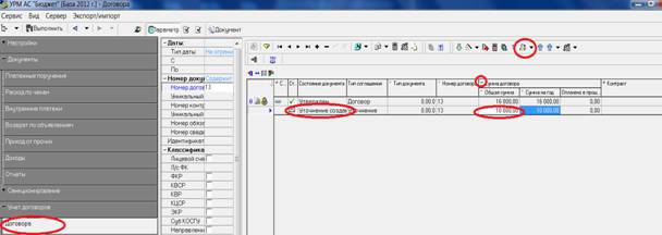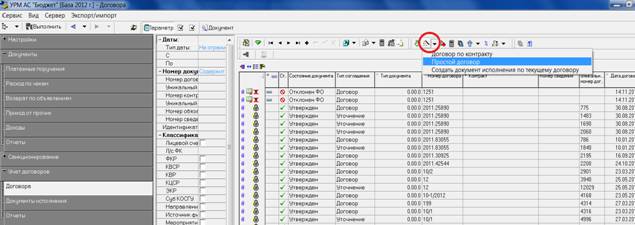 В интерфейсе программы Учет договоров – Договора, когда договор в состоянии «На рассмотрении ФО» или «Утвержден», можно создавать ДИ с помощью кнопки Создать документ по договору