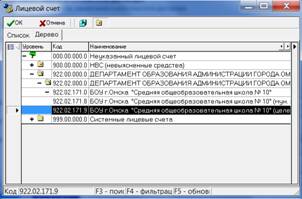 . В открывшемся справочнике выбирается Лицевой счет организации, являющейся заказчиком по договору. Обратите внимание, что лицевой счет должен быть не обобщающим, а конечным счетом получателя, н-р 922.02.171.9 (как показано на рисунке). Так как справочник является иерархическим, то изначально вы видите только обобщающие счета. Для получения конечных Л\С нажмите на «+» рядом с обобщающим лицевым счетом, и программа покажет дальнейшую структуру. После того как вы выберете нужный лицевой счет нажмите «ОК».