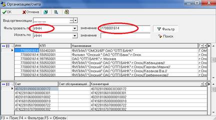 Фильтр, и программа выберет из всего справочника только те организации, которые удовлетворяют заданному условию. Выбираете необходимые Вам КПП и счет. Нажимаете