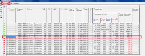 Перед вами откроется окно «Документы» для подбора классификации, ориентируясь на весь список КБК и остаток годовой росписи. Ищите в списке нужный КБК, не забывая про дополнительные классификаторы такие как, «СубКЭСР», «Мероприятие». Встаёте на строку с нужной КБК курсором, проверяете горит ли слева зелёный шарик, означающий, что остаток средств по росписи достаточен для регистрации данного договора.