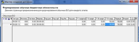 Если же на основе данного договора обязательства возникают по нескольким классификациям, то Подбор классификации проходит дважды. После подбора первой классификации по строке проходите вправо до столбца I квартал (или II квартал, III квартал, IV квартал) и меняете сумму. Затем нажимаете стрелка на клавиатуре ↓ для создание второй строки. И снова нужно нажать кнопку