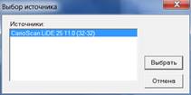 После этого появится ещё одно небольшое окно с выбором сканера – «Выбор источника», где необходимо выбрать установленный на вашем компьютере сканер щелчком мыши по названию вашего сканера, а затем кнопку Выбрать.