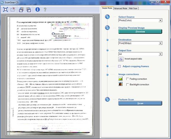 Данное окно может отличаться от того, которое представлено на рисунке (это зависит от самого сканера). Инструменты открывшегося окна «сканирование» позволяют изменить размер/границы отсканированного документа, повернуть/перевернуть его.