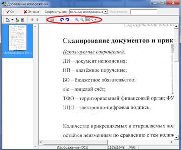 После завершения работы с этим документом, нажимаем кнопку «Сканировать» либо еще какая-либо похожая кнопка – зависит от вашего сканера. Появляется снова окно «Добавление изображений» только уже с изображением только что отсканированного документа. Здесь вы можете изменить положение отсканированного документа (повернуть/перевернуть его), воспользовавшись кнопками на панели кнопок.