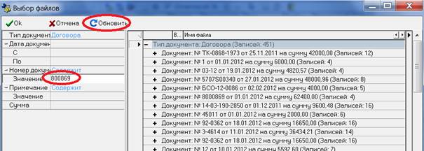 В появившемся окне Выбор файлов в поле Значение ставите номер договора, из которого хотети добавить файлы, затем нажимаете кнопку Обновить и выбираете необходимые Вам изображения.