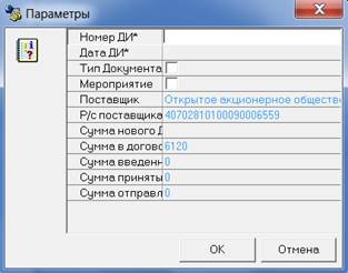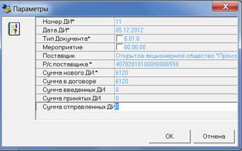Появляется окно Параметры! Необходимо заполнить поля Номер ДИ (в соответствии с Вашим печатным документом – счет-фактурой, например), Дата ДИ, выбрать Тип Документа, Мероприятие (если нужно), Сумма нового ДИ.