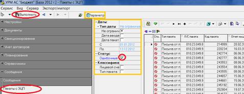 В параметрах ставите галочку Статус – Ошибочные, нажимаете кнопку Выполнить и отображаются пакеты с ЭЦП, которые имеют статус ошибочные.