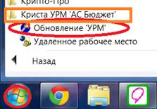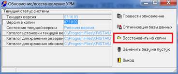 Восстановление программы из копии выполняется – Пуск – Все программы – Криста УРМ АС Бюджет – Обновление УРМ. В диалоговом окне Обновление/Восстановление УРМ нажимаете кнопку Восстановить из копии.