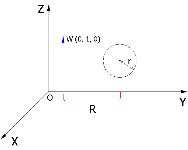 2. Вращение окружности вокруг вектора w, находящегося в центре тора, при этом сохраняя координаты вращающейся окружности (Рис. 5).
