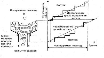 Поступающие в воронку заказы изображены на рисунке и виде шаров различной величины. Объем шара соответствует трудоемкости заказа. Система имеет максимальную пропускную способность (мощность), которая достигается при условии »рационального планирования материальных потоков (распределения заказов по отрезкам планового, периодами формирования очередности выполнения работ).