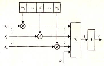 где wi - вес(weight)синапса, i = 1...n;b - значение смещения (bias); s - результат суммирования (sum); хi - компонент входного вектора (входной сигнал), i = 1...n; у - выходной сигнал нейрона; n - число входов нейрона; f - нелинейное преобразование (функция активации).