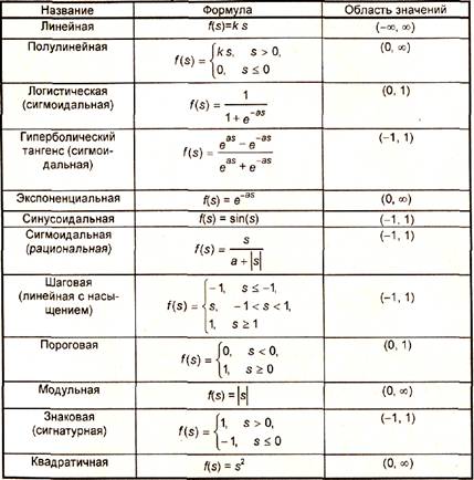 На входной сигнал (s) нелинейный преобразователь отвечает выходным сигналом f(s), который представляет собой выход у нейрона. Примеры активационных функций представлены в табл. 1.1 и на рис. 1.3.