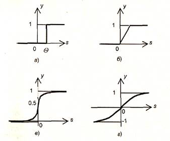 а - функция единичного скачка; б - линейный порог (гистерезис); в - сигмоид (логистическая функция); г - сигмоид (гиперболический тангенс)