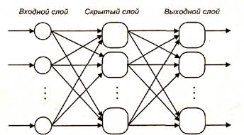 Среди многослойных сетей без обратных связей различают полносвязанные (выход каждого нейрона q-гo слоя связан с входом каждого нейрона (q+1)-го слоя) и частично полносвязанные. Классическим вариантом слоистых сетей являются полносвязанные сети прямого распространения (рис. 1.5).