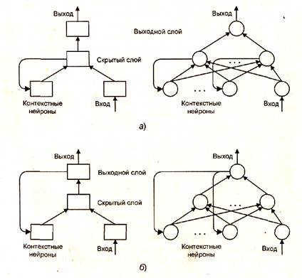 Рис. 1.6. Частично-рекуррентные сети: а - Элмана, б - Жордана