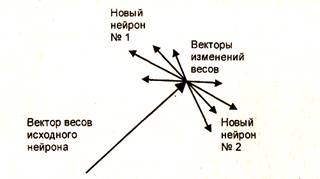 На этом рисунке показан вектор весов нейрона скрытого слоя на некотором шаге обучения и векторы изменения весов, соответствующие отдельным обучающим примерам. Векторы изменений имеют два преимущественных направления и образуют в пространстве область, существенно отличающуюся от сферической. Суть алгоритма заключается в выявлении и расщеплении таких нейронов. В результате расщепления вместо одного исходного в сети оказывается два нейрона. Первый из этих нейронов имеет вектор весов, представляющий из себя сумму вектора весов исходного нейрона и векторов изменений весов одного из преимущественных направлений. В результате суммирования векторов изменений весов другого преимущественного направления и вектора весов исходного нейрона получают синаптические веса второго нового нейрона.