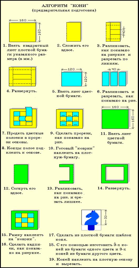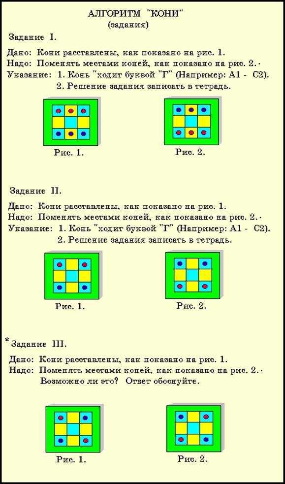 Алгоритм "КОНИ", на мой взгляд, следует рассматривать после прохождения темы "Координатная плоскость", когда учащиеся способны самостоятельно определять координаты клетки.