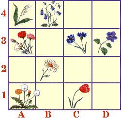 В клетках координатной плоскости размером 4 * 4 размещены цветы; при этом координаты клеток даны в буквенно-цифровой форме. (см. рис.)Задание можно начать, к примеру, следующим образом:
