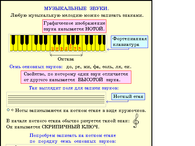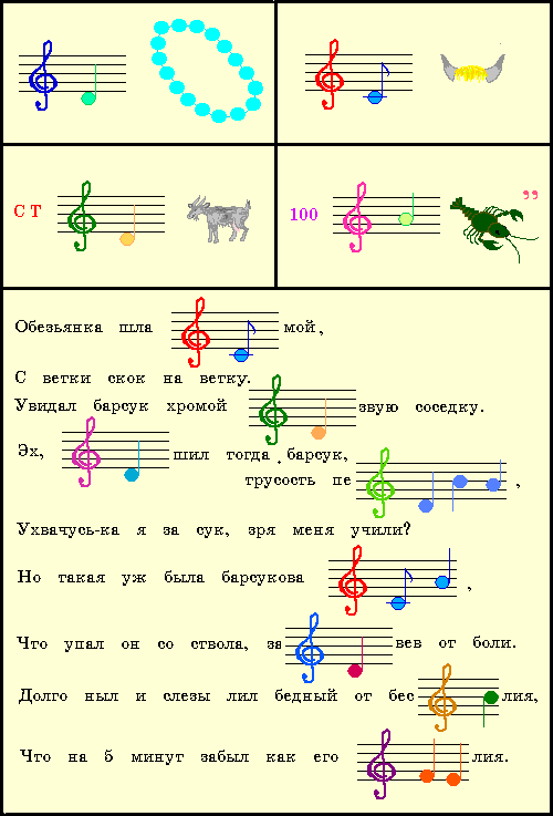 Незнакомство большинства учащихся с основами музыкальной грамотности не должно мешать работе с музыкальным редактором. На первом этапе работы с редактором целесообразно, на мой взгляд, использовать некие карточки-консультанты , а при проверке усвоения материала (в частности, названия нот) использовать "музыкальные" ребусы. Некоторые из тех, что я использую на уроках, предложены ниже: