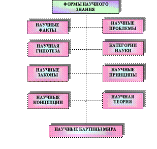 К формам научного знания относят проблемы, научные факты, гипотезы, теории, идеи, принципы, категории и законы (см. рис.4).