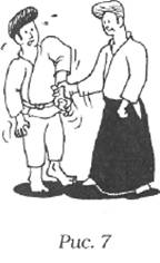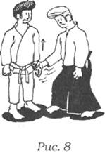 Состояние полного расслабления - это отсутствие напряжения и агрессивности. В тот момент, когда вы чувствуете себя агрессивными, вы находитесь в состоянии психологического напряжения. В соответствии с указанными выше четырьмя принципами, вы должны развить отношение непротивопоставления, привычно избегая конфликта. Чтобы научиться полностью расслабляться и избегать напряжения в теле, не становясь слабым, мастер Тохеи предлагает следующее очень полезное упражнение. Стоя, предплечьями и кистями рук делайте быстрые стряхивающие движения вниз, сгибая при этом локти, словно отряхивая воду с рук. Если мускулы верхней части тела (руки, плечи, спина) расслаблены, вы испытаете приятные ощущения и, возможно, почувствуете покалывание в руках. Вы также почувствуете себя взбодренными и устойчивыми. Если вы проверите это упражнение тестированием, ваша убежденность возрастет: попробуйте поднять руку (как на рис. 7). При пассивной релаксации рука согнется, а если тело напряжено, тогда сдвинется все тело. Если вы, проделав это упражнение, попробуете еще раз, рука уверенно останется в своей исходной позиции, и тело тоже останется стабильным (рис. 8).