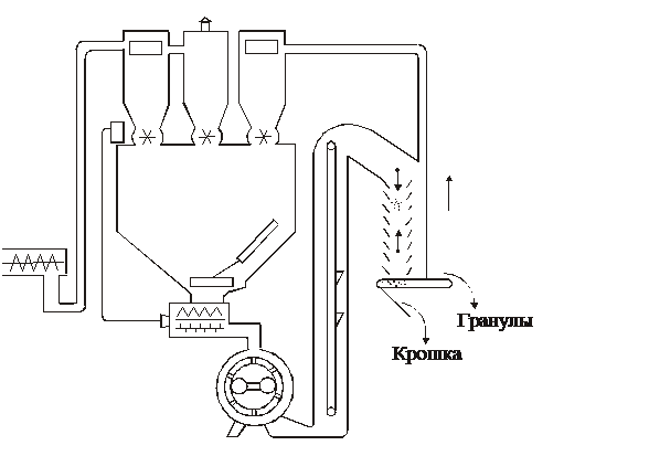 Охлаждение гранул.Гранулы выходят из пресса с температурой 65 – 96 0С. при такой температуре они не пригодны к складированию и хранению. Поэтому их охлаждают.