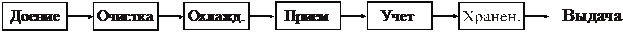 доение – Транспортировка – прием – учет – очистка – Пастеризация – охлаждение до 10 0С – хранение – выдача.