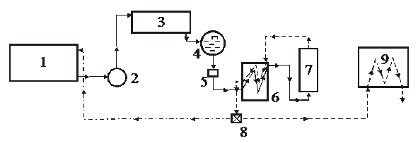 1 - приемный бак; 2 – насос; 3 - напорный бак; 4 - бак постоянного уровня; 5 - регулировочный вентиль;6 - теплообменник (регениратор); 7 – электропастеризатор; 8 - трехходовый вентиль; 9 – охладитель.