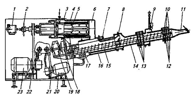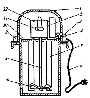 Нагрев происходит превращением электрической энергии в механическую, а затем в тепловую, т. е. в энергию молекулярного трения. Общий к. п.д. их не ниже 75 %, n=4000…5000 об/мин. Схема такого пастеризатора показана на рисунке 22.13.