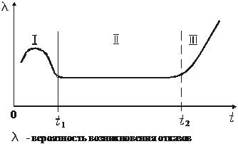 Отказы изделий в процессе их работы (и износовые, и внезапные) имеют три периода: приработочные; износные и внезапные (Рис.24.5.).