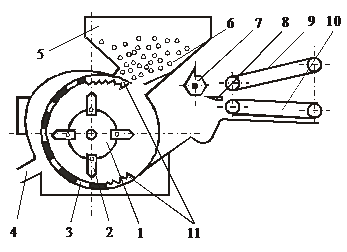 Рис.10.8. Схема универсальной дробилки: 1 - ротор; 2 - молоток; 3 - решето; 4 - отсасывающий патрубок; 5 - приемный бункер; 6 - регулировочная заслонка; 7 - режущий барабан; 8 - противорежущая пластина; 9 - нажимной транспортер; 10 - питающий транспортер; 11 - дека. |
