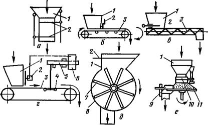 Рис.12.1. . Схемы дозаторов: а - объемного порционного; б - объемного ленточного; в - объемного шнекового; г - массового (весового) автоматического непрерывного действия; д - объемного барабанного; е - объемного тарельчатого; / - бункер; 2 - заслонка с механизмом управления, 3 - ленточный транспортер; 4 - датчик весов, 5 - балансир весов; 6 - командный аппарат; 7 - барабан; 8 - корпус; 9 - скребок; 10 - манжета; 11 - диск. |