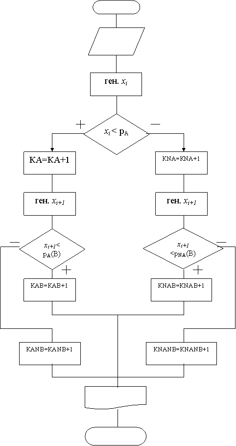 . Если условие выполняется, то считается, что событие В произошло и на 1 увеличивается один из счетчиков: либо КАВ=КАВ+1 (если событие А имело место); либо КNАВ=КNАВ+1 (если событие А не произошло). Если условие не выполняется, то событие В не произошло и один из счетчиков увеличивается на 1: либо КАNВ=КАNВ+1 (если событие А имело место); либо КNАNВ=КNАNВ+1 (если событие А не произошло).