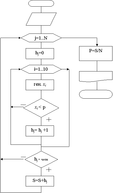 . Если условие выполняется, то считается, что событие А произошло и счетчик событий увеличивается на 1: КА=КА+1. Если условие не выполняется, то событие А не произошло и соответствующий счетчик увеличивается на 1: КNА=КNА+1.