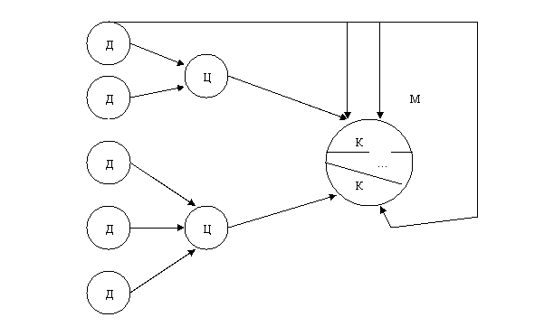 Классический подход. Исторически первым сложился классический подход к изучению объекта, моделированию системы. Классический подход синтеза модели (М) системы представлен на рис. 1. Реальный объект, подлежащий моделированию, разбивается на подсистемы, выбираются исходные данные (Д) для моделирования и ставятся цели (Ц), отражающие отдельные стороны процесса моделирования. По отдельной совокупности исходных данных ставится цель моделирования отдельной стороны функционирования системы, на базе этой цели формируется некоторая компонента (К) будущей модели. Совокупность компонент объединяется в модель.