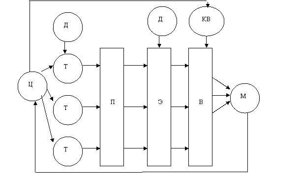 На основе исходных данных (Д), полученных на основе анализа внешней среды, цели функционирования (Ц) формулируются требования (Т) к модели системы. На базе этих требований выделяются ориентировочно подсистемы (П), элементы (Э) и осуществляется наиболее сложный этап синтеза модели – выбор составляющих систем, для чего используются специальные критерии выбора (КВ). Системный подход предполагает последовательный переход от общего к частному, когда в основе рассмотрения лежит цель, причем исследуемый объект выделяется из окружающей среды.